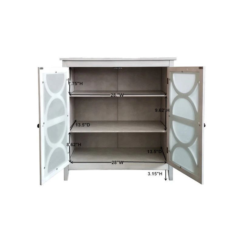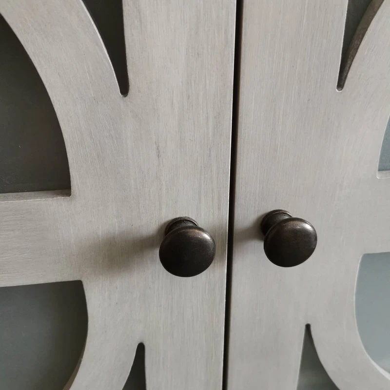 Pasco 2 Door Entryway Accent Display Cabinet With Storage Shelves & Frosted Glass Doors, Wash Gray Wood, Contemporary. Whether you’re looking for a simple storage solution in the living room or setting the stage for a low-key display in the den, this understated Pasco Accent Cabinet brings a bold touch to your space without stealing the show. Featuring a clean-lined wood frame and two frosted glass-paneled doors with moon shaped details, this Pasco Accent Cabinet makes a versatile and impactful addition to your environment. Crafted from manufactured wood, this piece features two bronze knob doors that open to reveal two shelves, perfect for tucking away linens, tablecloths, placemats, and much more.