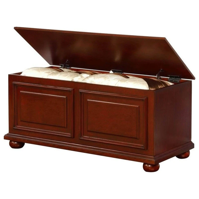 Simply classic, this cherry cedar chest is the perfect addition to your home decor. Blending style and function with raised panels, decorative molding, bun feet, and a rich cherry finish. The top opens wide to reveal ample storage space and is cedar lined. Safety is a priority with child safe hinges and breath holes. Some assembly required.
