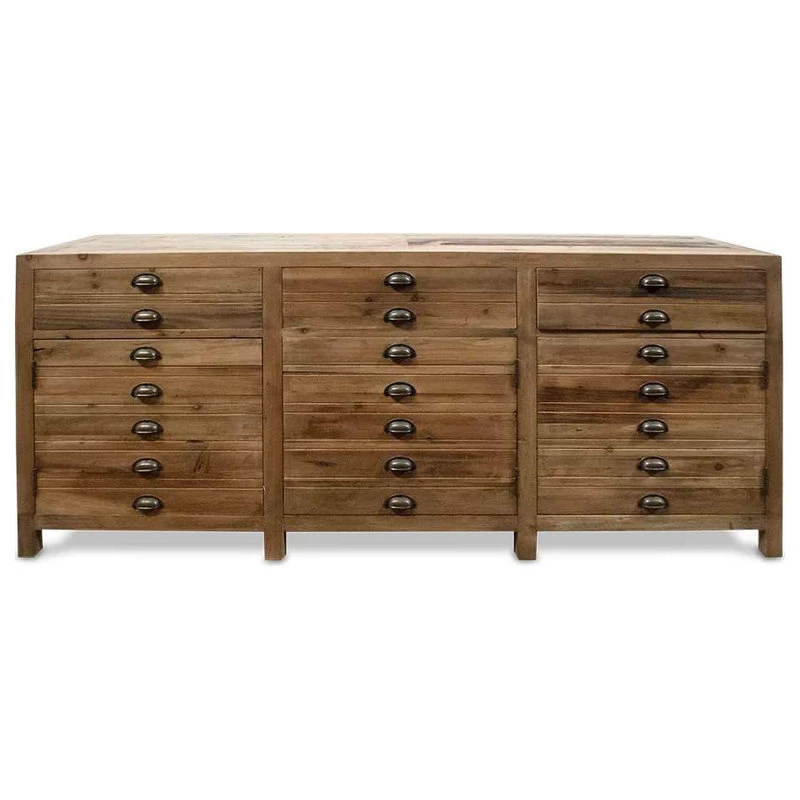 Generously scaled to provide space for all of your dining essentials, our Salem Buffet features 3 top drawers and concealed shelving below. It is crafted of reclaimed wood with oil-rubbed bronze clamshell pulls.