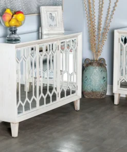 Brimfield & May Modern Rectangular White Wood And Glass Geometric Cabinet, 34″ X 32L” X 16″