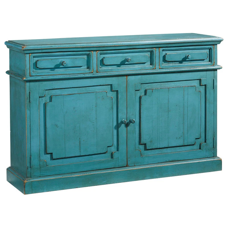 Function and beauty are just two characteristics of this awesome accent cabinet. Cabinet doors have a cool medallion moulding design and drawers have a similar design. Finished in a new breathtaking Antique Aqua color that will energize any setting. Cabinet interior includes one large shelf for spacious hidden functional storage. A great accent to your kitchen, dining room, living room, even bedroom. This eclectic piece will only enhance your style and provide your needs.