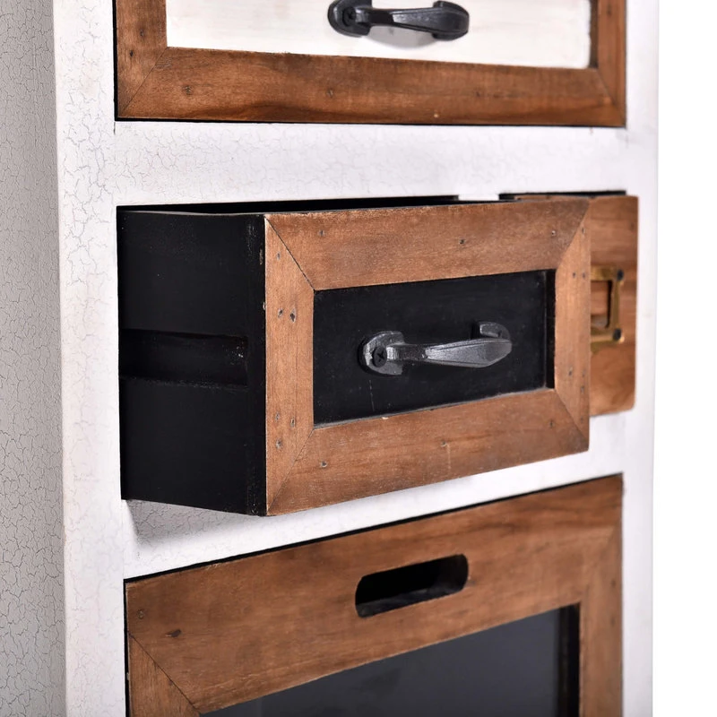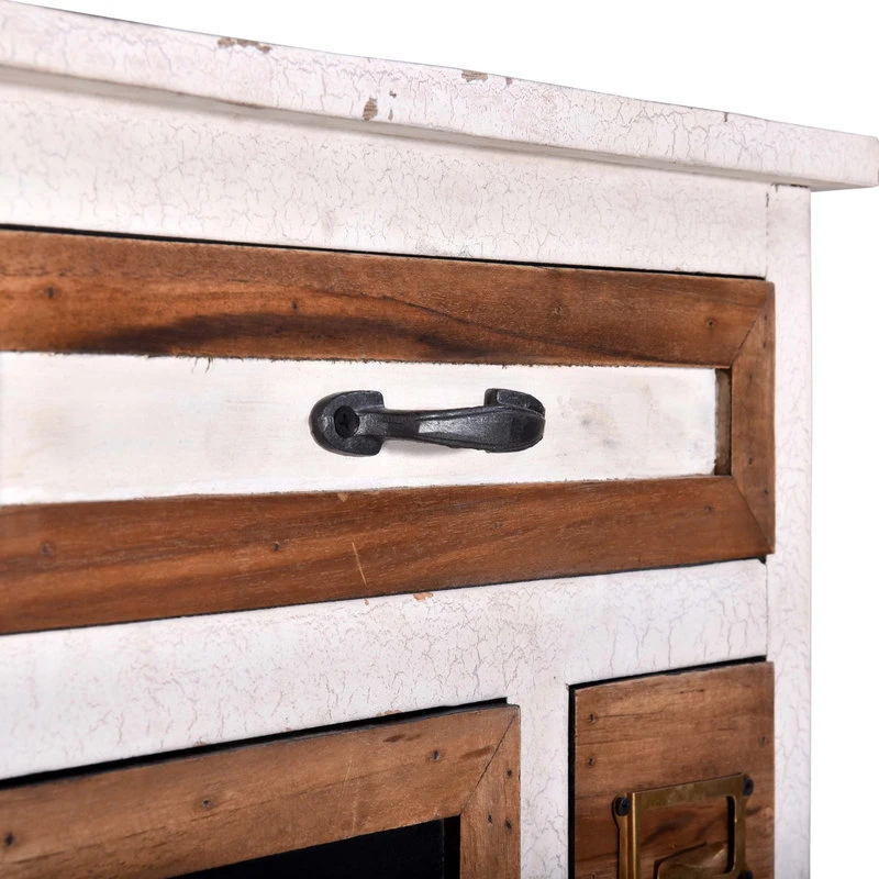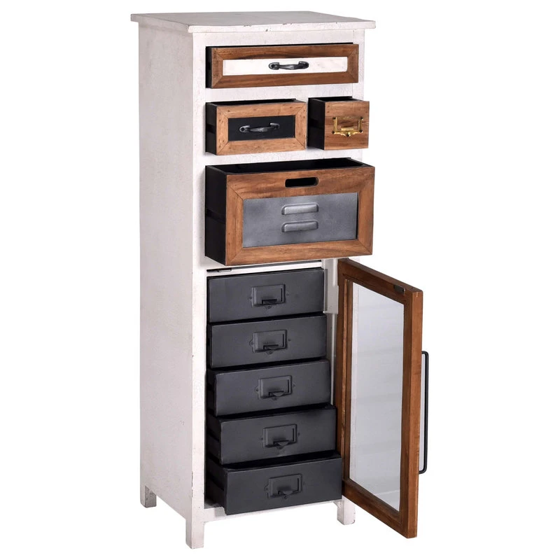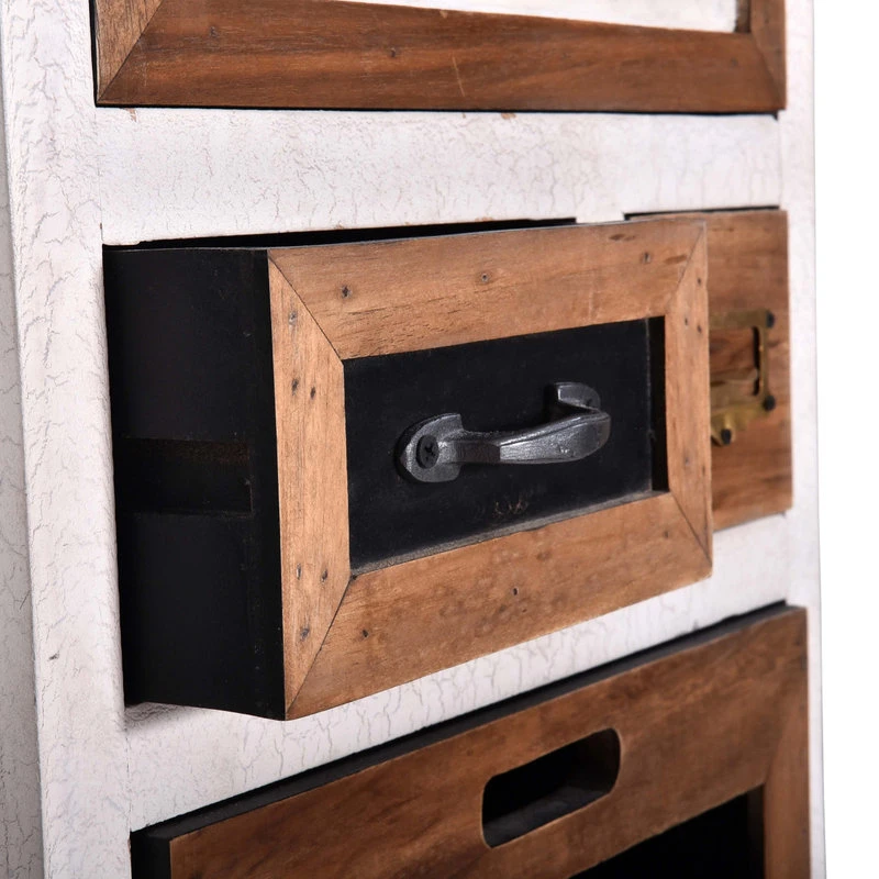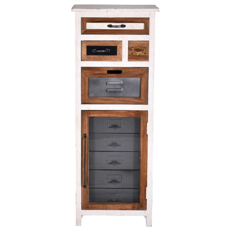 Fun and creative pieces to spice up any space. Constructed of mango wood with MDF and metal accents. White finish looks aged with a cracked paint technique for texture. A natural wood detail around each drawer and cabinet. Metal drawers not only add strength but looks incredible contrasted with the other finishes. These designs have so much detail and function. Perfect for bedrooms, living rooms, kitchens, even home offices.