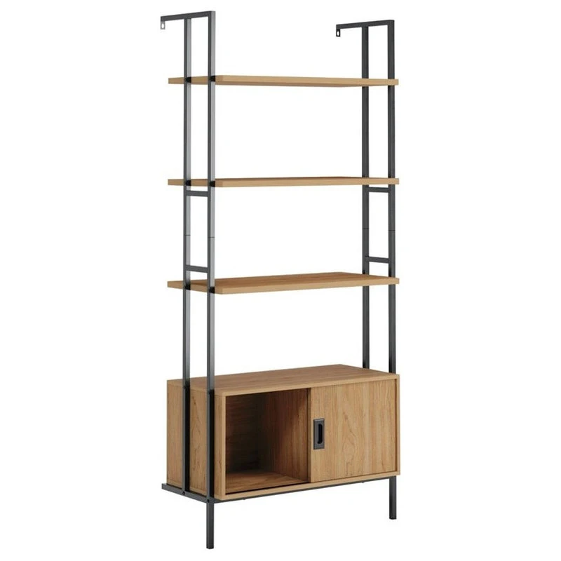 Redefine the look of your home with the mid-century inspired style and modular design of this wall-mounted bookcase with door from the New Hyde collection. This wall-supported storage solution features four large open shelves that offer the ideal amount of convenient storage for items like your collection of novels, binders, home décor magazines, and organizing bins too. These spacious shelves are also great for displaying your home décor items like decorative plants and pictures of family, friends, and pets. The cubby hole storage are features a sliding door so you can easily display the best and hide the rest. Its versatile design and charming good looks make this bookshelf the perfect addition to any room in your home. Finished in serene walnut and paired with a durable, black powder coated metal frame, this unique shelving unit gives your home the style you want with the functionality that you need.
