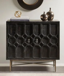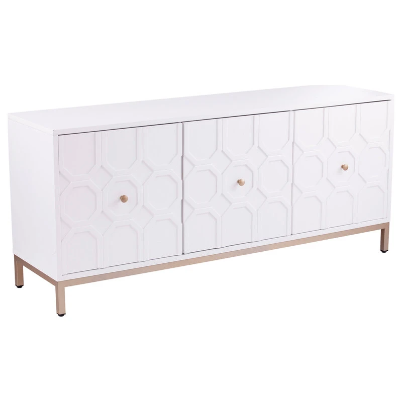 Carve out storage space with this accent cabinet. Ample shelving awaits behind handsome, Moroccan style carved doors, ready for your stemware, board games, or movie list. Contrasting hardware and metal base add a touch of color to the fresh white, low-profile silhouette. Swing wide with this anywhere cabinet beneath your wall mounted TV or anchoring your dry bar in your open concept entertainment space.