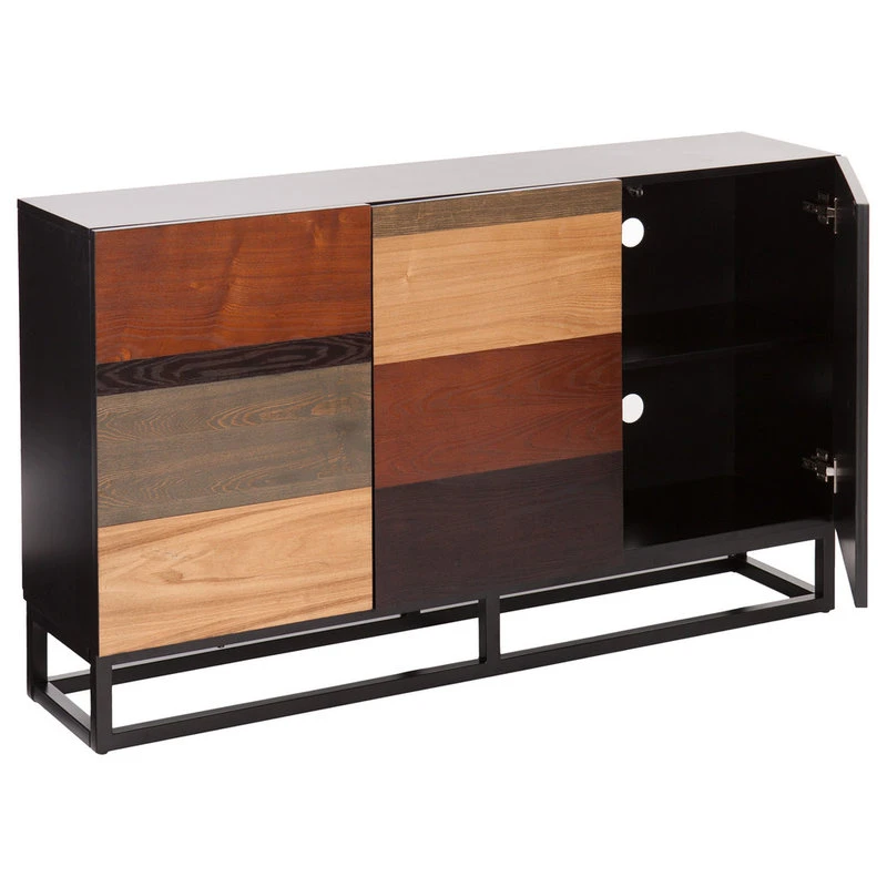 When you can’t pick one wood finish, pick them all! With this ambiguous, multi-tonal credenza, wood grains come in shades you love. Three spacious cabinets hide behind perfectly mismatched doors whose hues create a captivating composition while the open black frame lifts the piece to an ideal height. Spacious adjustable shelves store linens, media accessories, or entertaining accoutrements; place this eclectically midcentury modern credenza anywhere in your home for instant panache.