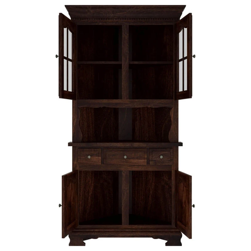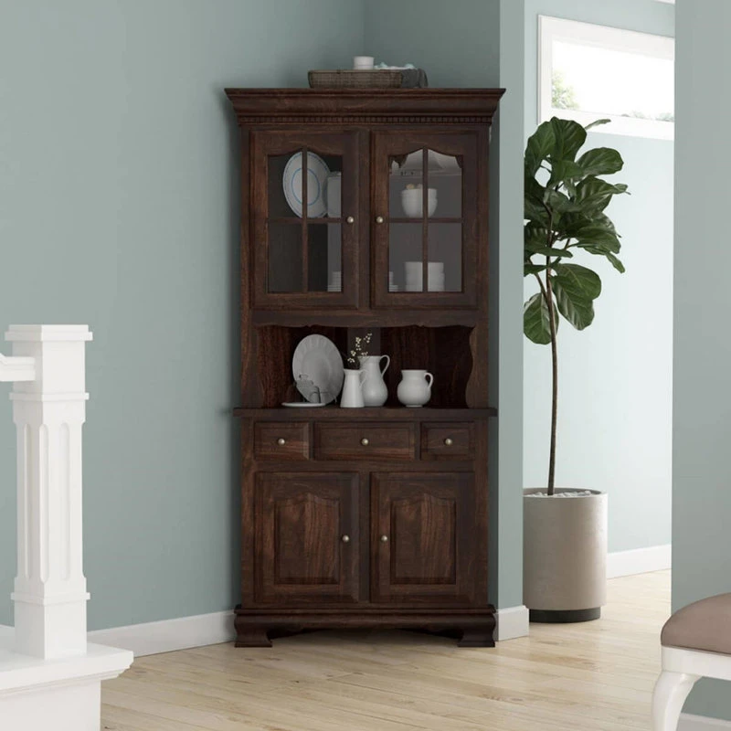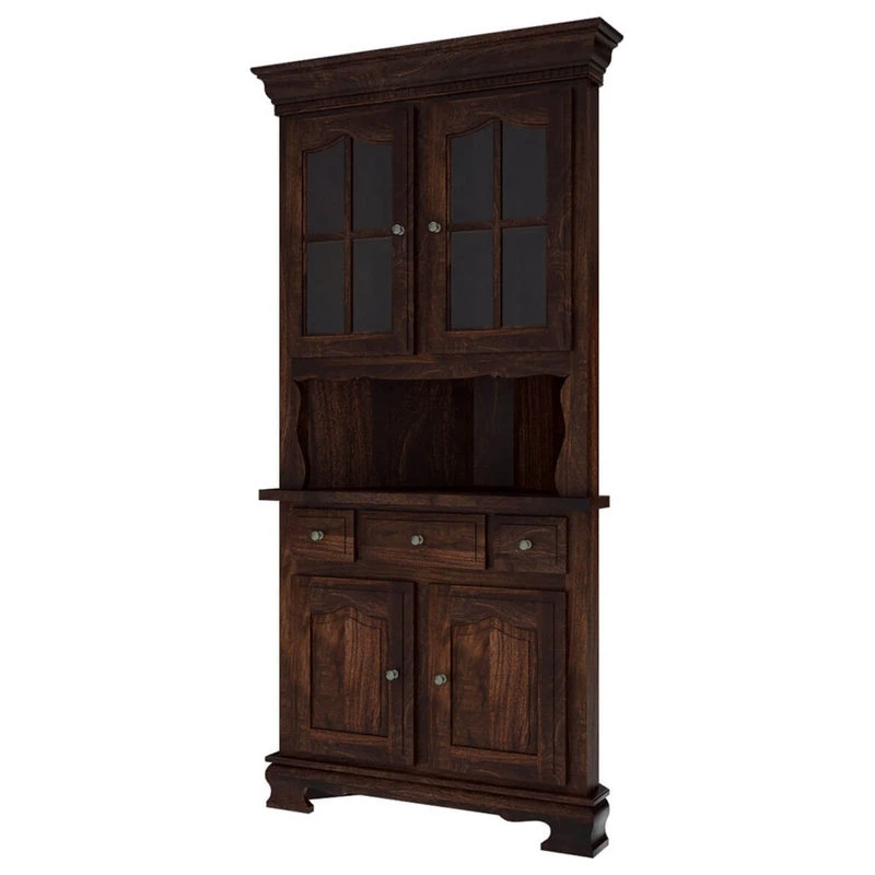 Discover the simple beauty of nature with our Carlinville Rustic Solid Wood Corner Hutch with Glass Cabinets. This dining corner hutch brings the natural beauty of handmade with an efficient storage layout to display and organize your dinnerware with ease. Store dishes, table linens, and more in the lower cabinet, then stash silverware in the three featured drawers, including two smaller drawers and one larger drawer. The open shelf surface area is perfect for setting up a coffee station or cookbook collection, while above, you can display your collectibles in the hutch with glass front doors and interior shelving. This rustic storage and display cabinet fits any corner perfectly to imbue an heirloom appeal to your home. This corner hutch is ideal for a dining room, but also fits into any living room, den, or sunroom configuration to bring a classy presentation of your goods and keepsakes. Handcrafted from solid wood, this three drawer hutch adds an Old World look and feel to any room while adding compact storage space where needed. With a beautiful trim finish and metal hardware, the style of this hutch is timeless, especially paired with the organic beauty of the wood’s inherent bands and grains. Special Features: • 100% Handcrafted • Made of solid wood • Glass-front display cabinet • Open shelf with decorative trim work • Two small drawers • One large drawer • Two base cabinets for enclosed storage Note: Real wood is a product of nature, and as such, no two pieces are alike. Variations in solid wood grain patterns are to be expected and make each furniture uniquely beautiful, just like us humans.
