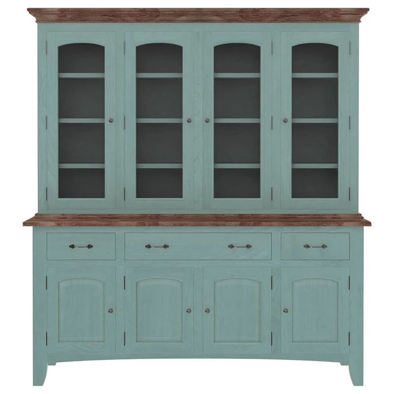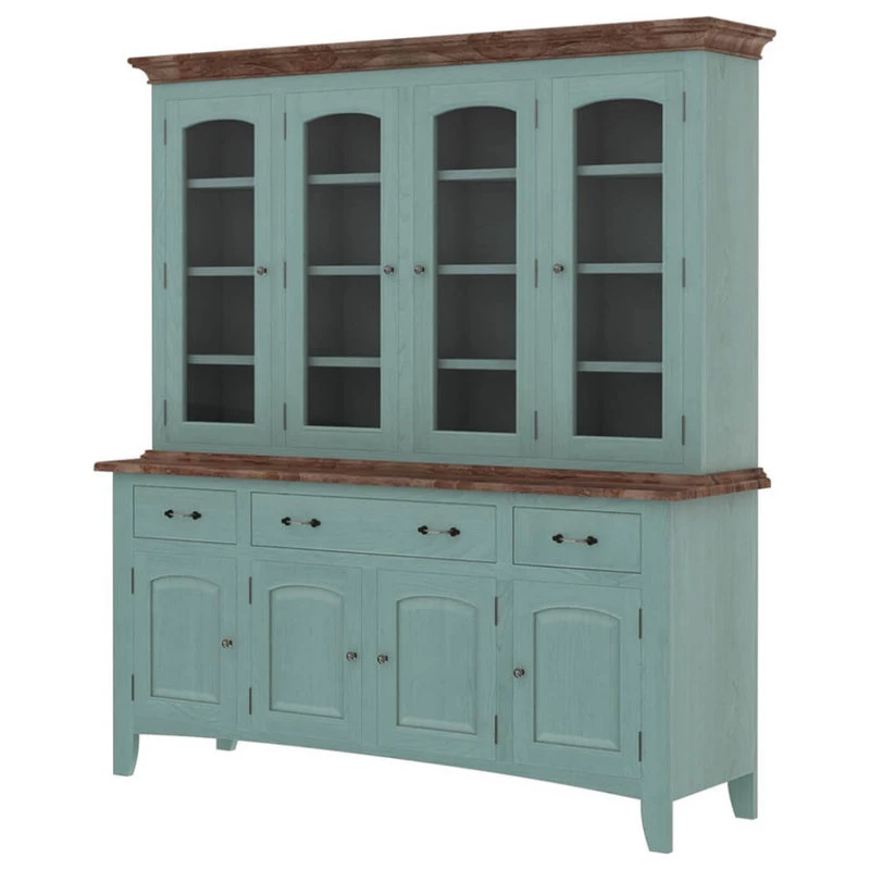 The sophisticated charm of our Meriden Mahogany Wood Two-Tone Blue Dining Room Buffet with Hutch is evident at first glance, and its incredible storage is wonderfully apparent with each and every use! Anchor your dining room decor and storage in the heirloom prestige of this solid wood buffet with hutch! This solid mahogany wood hutch supplies relaxed sophistication for creative and easy entertaining with a bevy of cleverly balanced closed and display style storage options. The buffet is outfitted with an impressive collection of cabinet space, featuring four doors with interior shelving. Perched above are three drawers of various sizes to accommodate your linen and silverware storage needs. The hutch is a maestro, showcasing your treasured collections and keepsakes in elegant form with four glass-front display cabinets complete with shelving for an efficient arrangement. It is easy to fall in love with the beauty of this rustic hutch. Handcrafted of solid mahogany wood, the Old World care and attention that went into its creation is evident in its durable dependability and timeless design. The attractive two-tone palette is an appealing mix of natural wood tones paired with a relaxed blue and finished with decorative molding that pulls the look together in sleek form. Special Features: • 100% Handcrafted • Made of solid wood • Glass-front display hutch with interior shelving • Two small drawers • One large drawer • Four cabinets with shelves for enclosed storage Note: Our furniture is made of solid wood (not wood veneer over plywood). It is handcrafted by Master Artisans. Real wood is a product of nature, and as such, no two pieces are alike. Variations in solid wood grain patterns are to be expected and make each furniture uniquely beautiful, just like us humans.