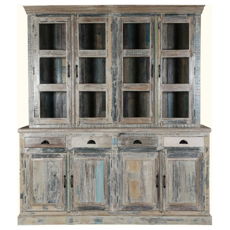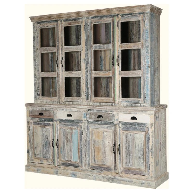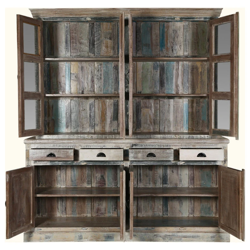 It’s easy to be charming with rustic furniture offering lots of storage space. Our Cavea Country Winter White Rustic Reclaimed Wood Large Dining Room Hutch with Sideboard has an authentic aged quality because it is built with reclaimed wood. Old wood is naturally weathered and seasoned over time. We honor this natural process and refrain from adding new paints or stains. This traditional breakfront has a classic dining room hutch style bottom with two double door cupboard sections and four top drawers. The top dining hutch section features two 3-shelf sections and two sets of double 3-pane doors. Special Features: • Authentically distressed reclaimed wood hutch • Solid wood back • Half shell and black iron handles • Wooden door latches Note: Our furniture is made of solid wood (not wood veneer over plywood). It is handcrafted by Master Artisans. Real wood is a product of nature, and as such, no two pieces are alike. Variations in solid wood grain patterns are to be expected and make each furniture uniquely beautiful, just like us humans.