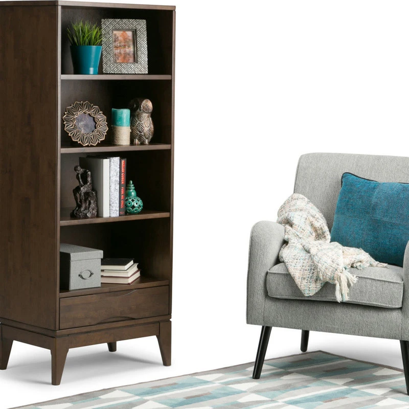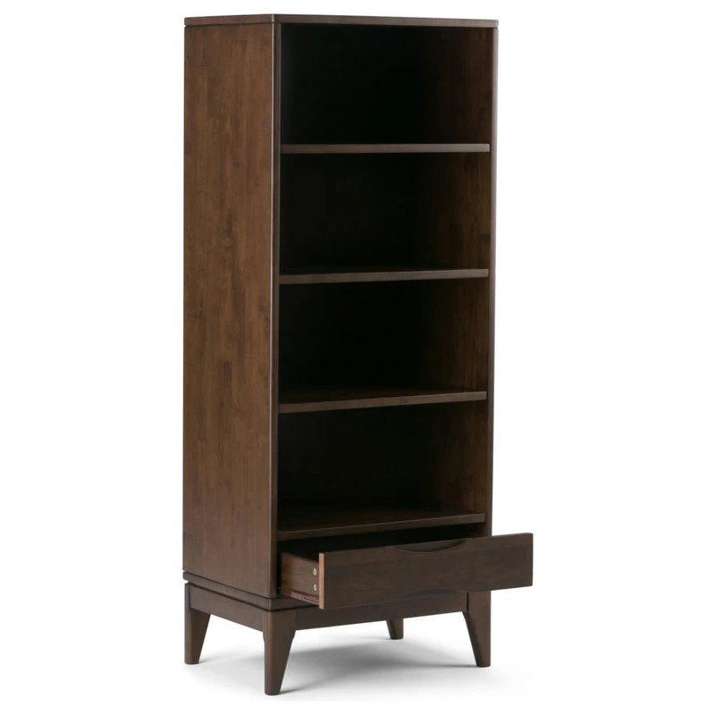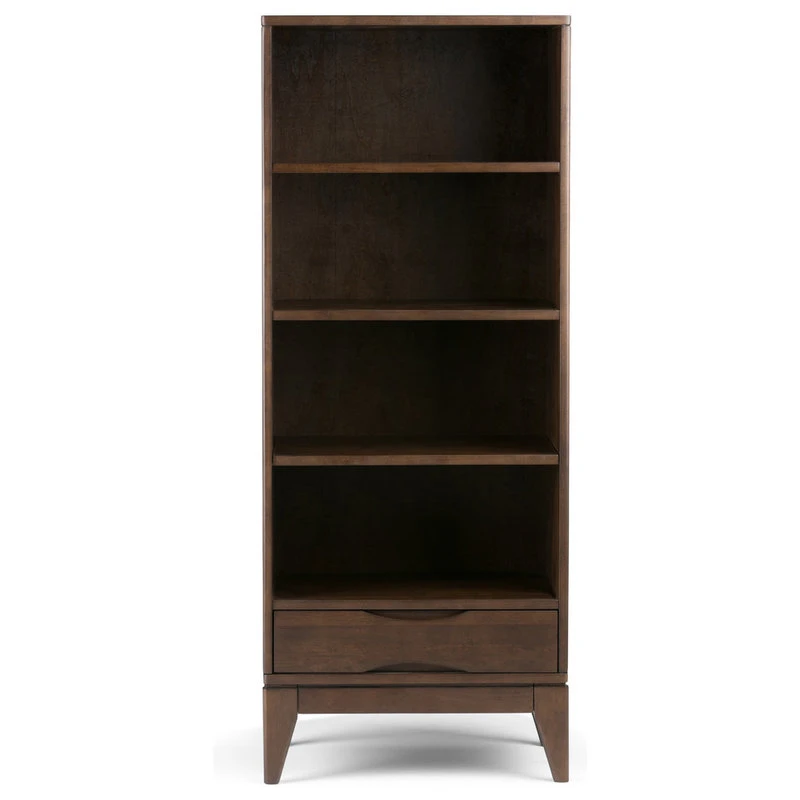 Display your favorite books and keepsakes in the Harper Bookcase with Storage. This bookcase is crafted of solid hardwood. This piece was designed for convenience and versatility. The Harper Bookcase with Storage features four shelves and a notched handle drawer providing the ultimate solution for all of your storage needs. Tapered legs deliver a clean lined, contemporary feel to your living room, family room or home office.