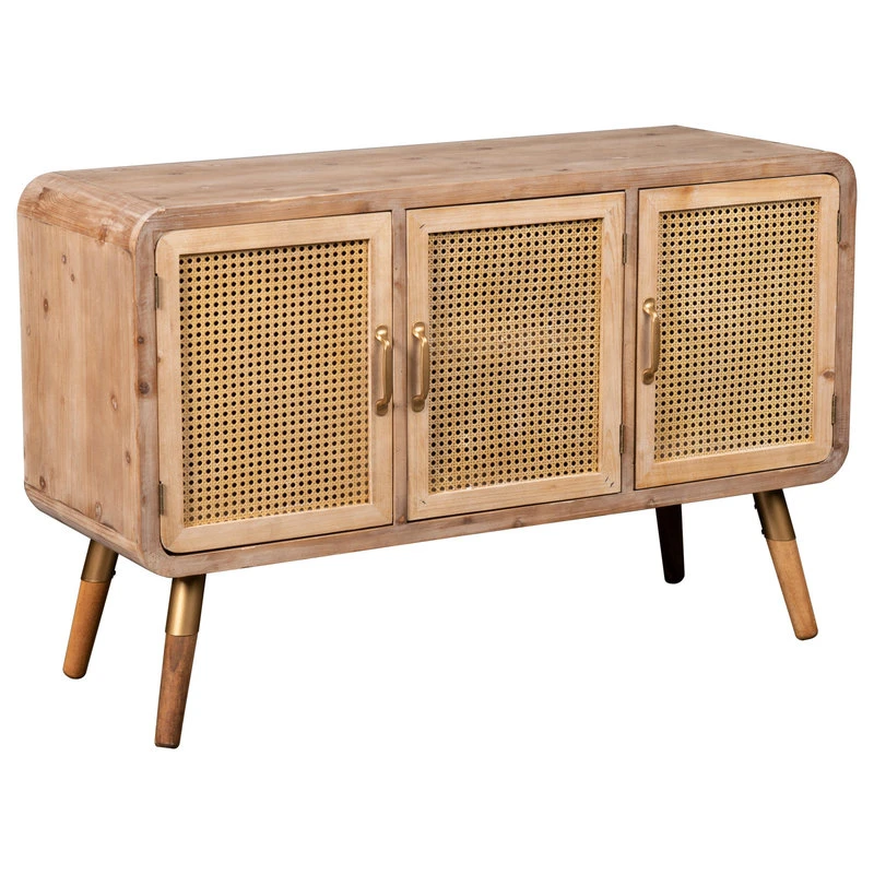 This accent cabinet with the modern vintage vibe is dressed up in natural, caned doors and has three separate cabinet spaces inside. The middle cabinet has a shelf in the middle. The cane details on the front doors, give this natural brown cabinet stunning artistry, adding interest and appeal to your room. Place it in your entryway, living room or dining area to give your space a personal touch that speaks to your creative spirit and lively aesthetic.