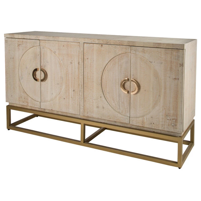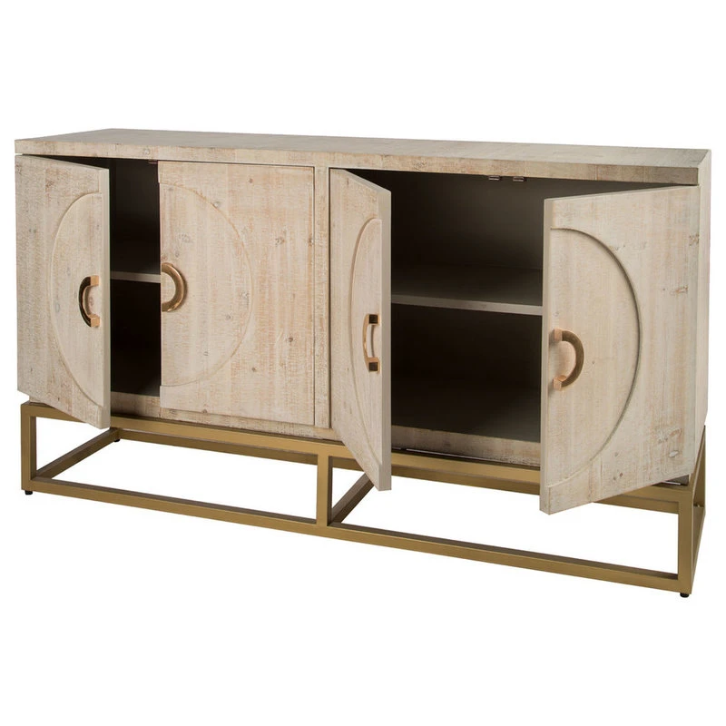The overall finish is a soft natural wood tone with contrasting gold legs and hardware. Supported on gold metal legs There are four doors, each house a shelf. Inside there is one big cabinet divided with a shelf from the middle.