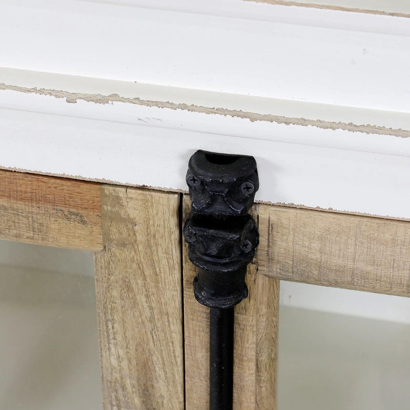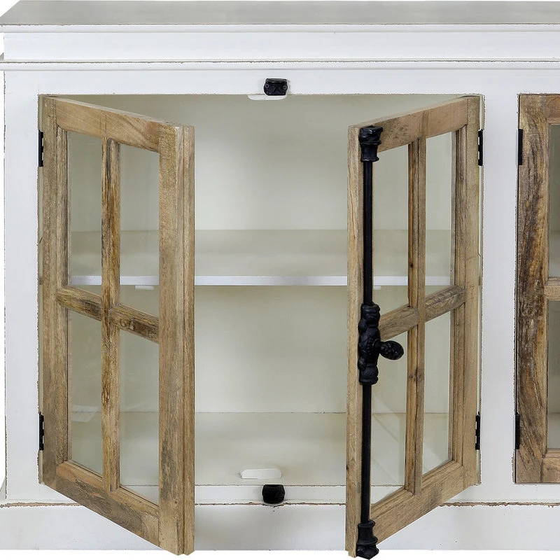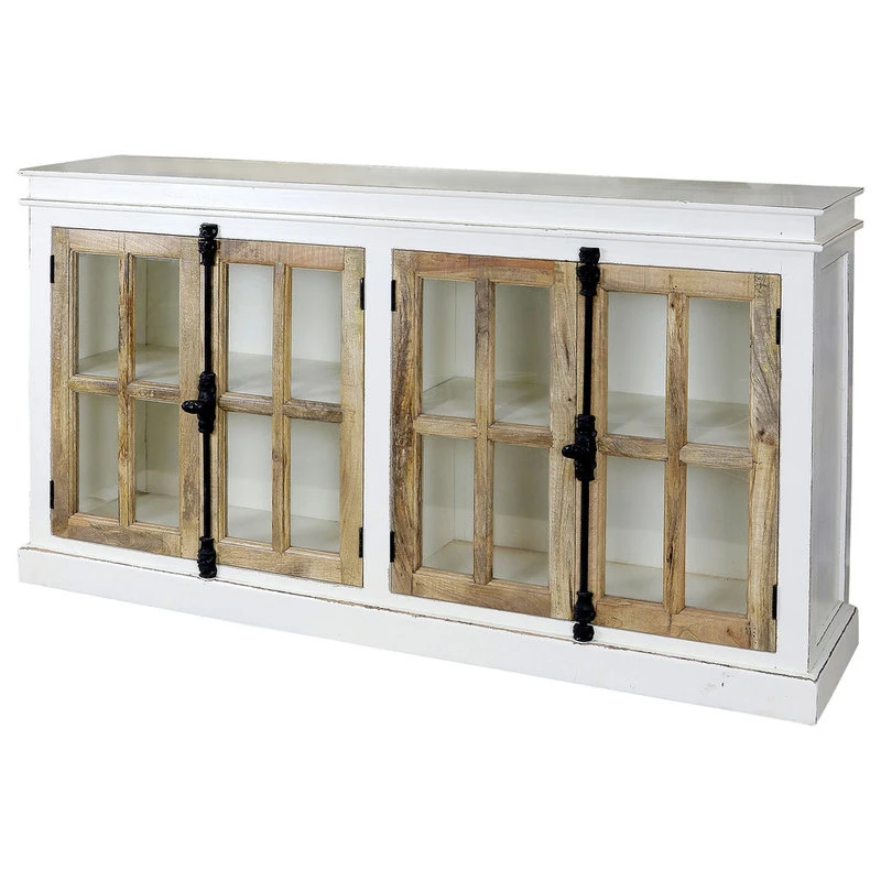 The Tucker credenza features four doors each with clear tempered glass window panes, classic French door locks, and two removable shelves. Its two-toned white and natural finish lends a refined touch to this exquisite design which is crafted from mango wood. It’s suitable for just about any room, from the living room, foyer, or home office.