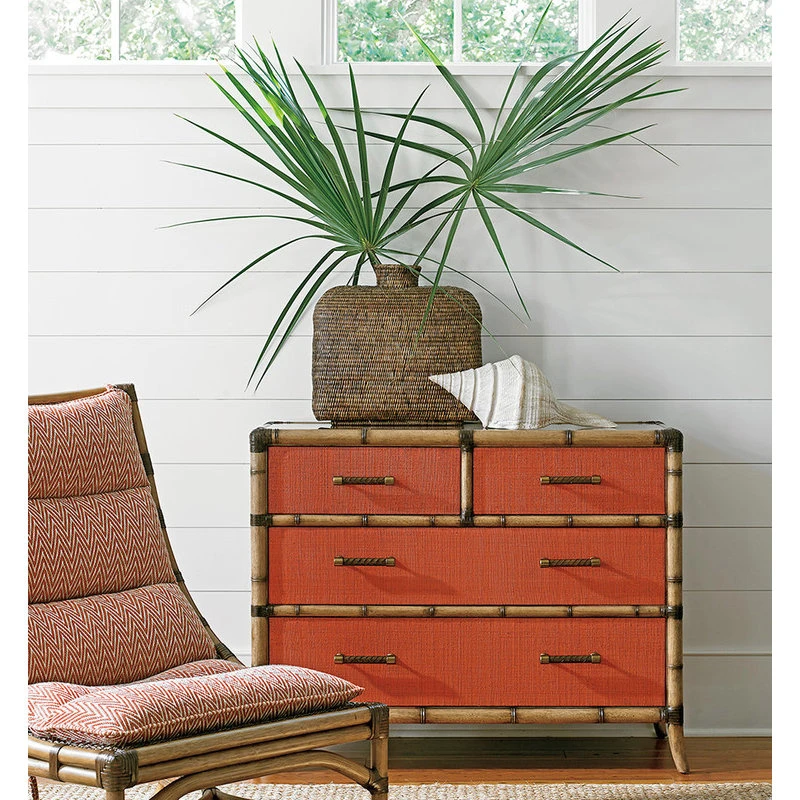 Accent pieces attract the viewer because of their design, color, placement, or pairing and this chest is no exception. The 4-drawer storage with fully finished interior in Red Coral is an added bonus. The chest features leather-wrapped bamboo carved moldings in the Bermuda Sands finish, with a contrasting woven raffia top, drawer fronts and end panels in a gorgeous Red Coral finish. We include a protective glass top. The chests can be used in a bedroom or paired with a mirror in a foyer to create a distinctive look.