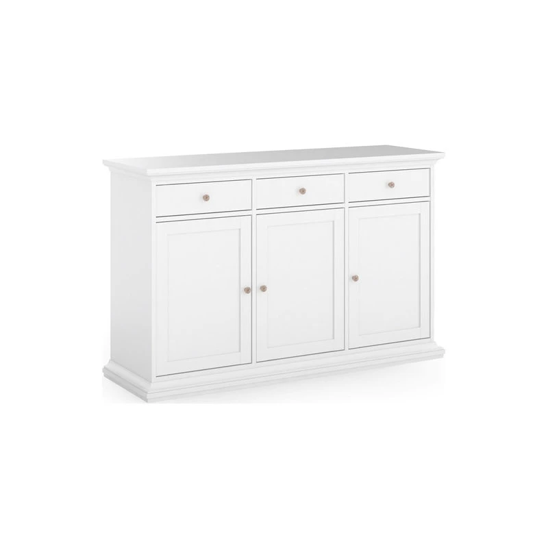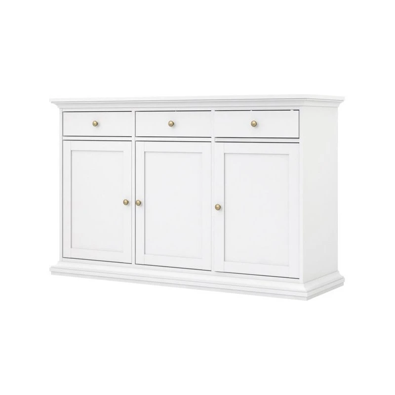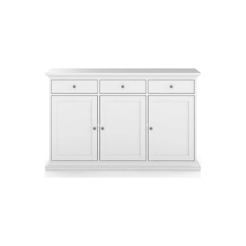 Accentuate your living space with the Sonoma 3 Drawer, 3 Door Sideboard. The traditional, romantic design has ample storage space that keeps your living room or dining room essentials organized and tidy while providing an area to display decorative showpieces. Complemented with top and bottom molding, rounded bronze colored metal handles and classic detailed finishes makes this is a perfect conversational piece. The foil finish also doubles down in durability as it protects from stains and fading. Combine the Sonoma 3 Drawer, 3 Door Sideboard with coordinating Sonoma items to complete the look.