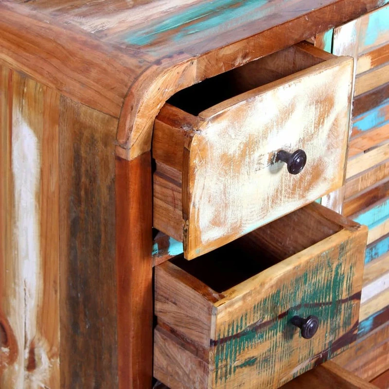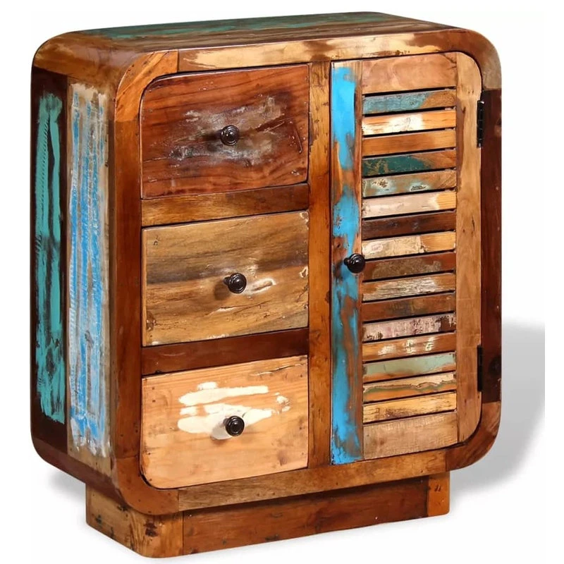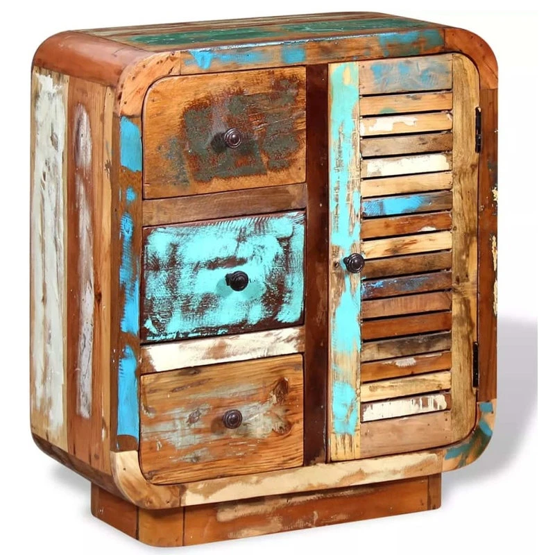 This antique-style wooden reclaimed side cabinet, coming with one spacious compartment with a door and 3 drawers, offers you ample storage space and helps you to maintain your items in great order. You can also put your computer, iPad, books, vases or some decorations on the sturdy top surface. Whether as a cupboard in the living room, or a cabinet in the bedroom, the reclaimed wood cupboard is a good choice. It can also be used as a side table, sideboard, high board, console table, etc. This storage cupboard is made of solid reclaimed wood, which means that every piece of furniture is unique and slightly different from the next. Furniture made from reclaimed wood has the characteristics of different woods like teak, mango wood and acacia. Reclaimed wood is solid, stable, durable, and beautiful. Signs of wear and visible grain structure give each piece its own history and a unique look. The cabinet is handmade, and the craftsmanship adds to its spectacular retro style. Every step of the process is carried out with the greatest care, be it polishing, painting or lacquering. Please note: colors vary from piece to piece, making each of our sideboards unique; the delivery is random.