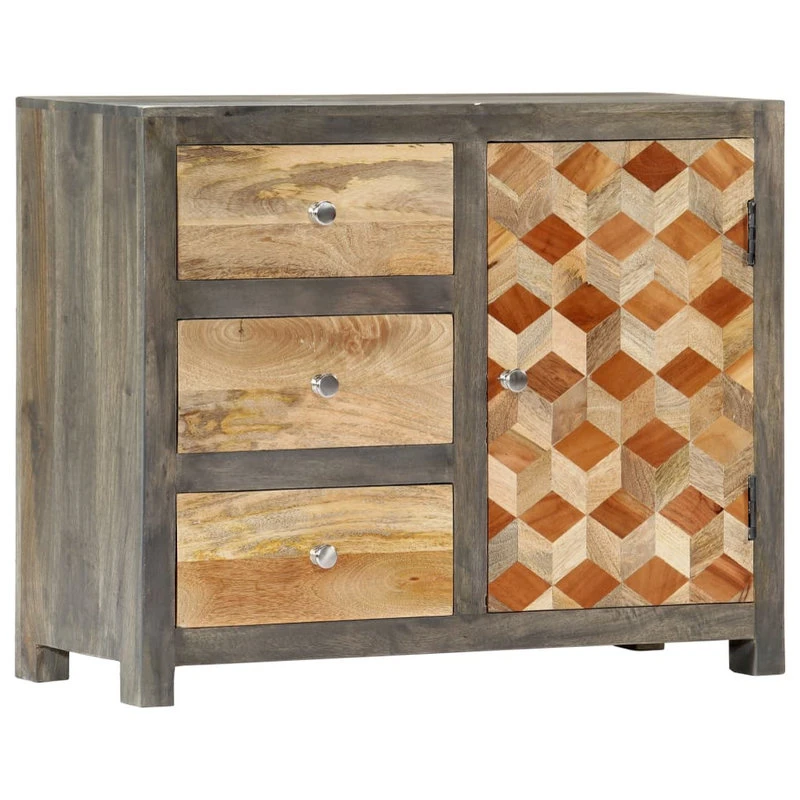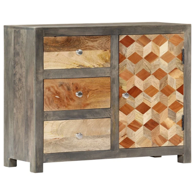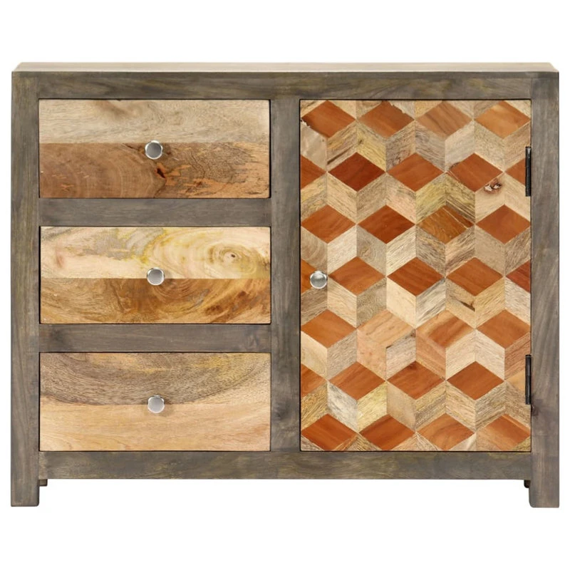 Bring the luxury of mid-century inspired design into your interior with our beautiful wooden side cabinet! Equipped with 1 door and 3 drawers for ample storage space, this sideboard will make a practical as well as decorative addition to your home decor. Made of solid mango wood, this storage cabinet has been given a beautiful finish by polishing, painting and lacquering, making it exude a refined look. Additionally, the diamond shaped pattern on the door adds to the side cabinet’s beauty. The sideboard is easy to assemble and clean with a damp cloth. Upgrade your interior to the next level with our elegant side cabinet!
