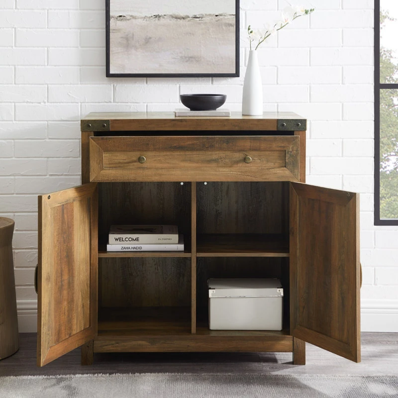 This 30-inch farmhouse accent cabinet is full of closed storage options since it comes with two-doors and a drawer with telescoping metal drawer glides. Behind the doors there is an adjustable shelf. The exposed hardware and handles feature an antique bronze metal finish that enhance the rustic tone of this storage unit.