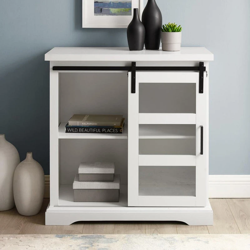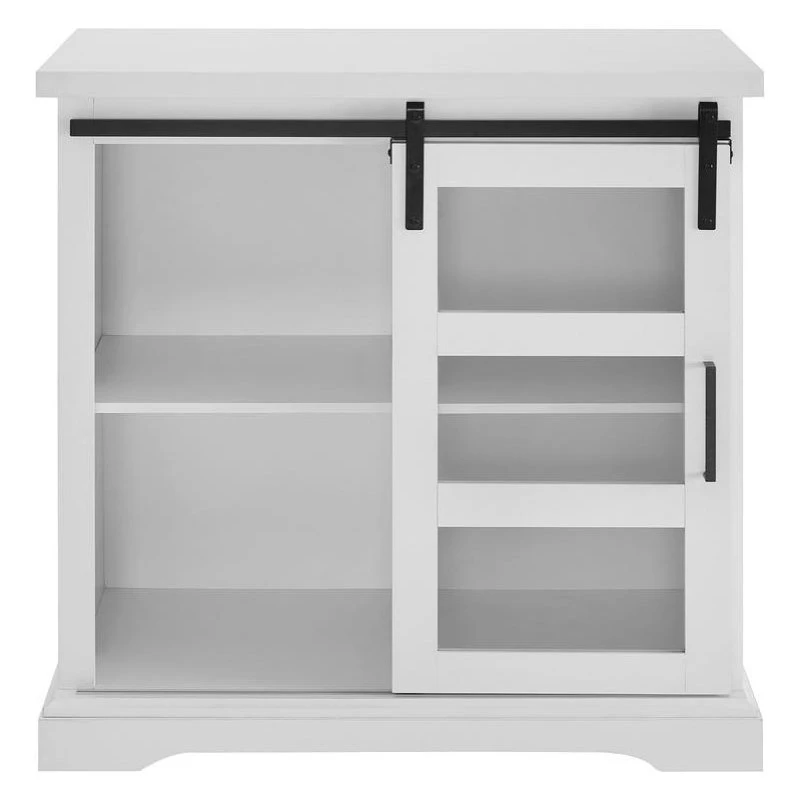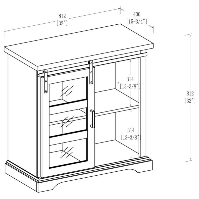 Add a transitional and modern aesthetic to your home with this 32-inch buffet. Of a mixed material design, this storage cabinet blends style with function. With a glass paned sliding barn cabinet door and a construction of high-grade MDF, durable laminate, and metal accents. As a TV stand, storage cabinet, or buffet in your living room, bedroom, or kitchen. Perfect for storing away your linens, kitchenware, electronics, or accessories.