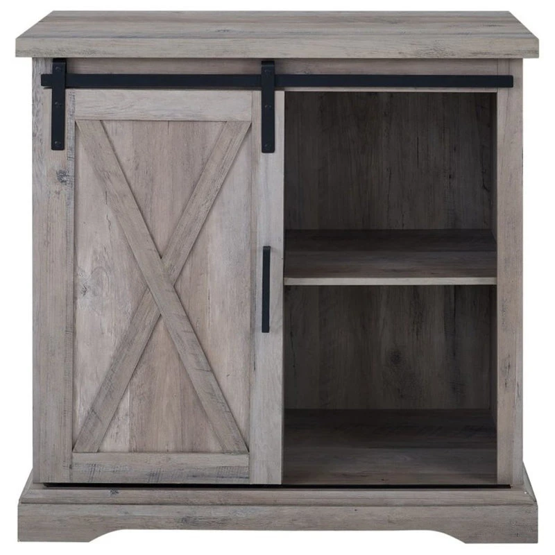 With a barn inspired cabinet door front, this 32-inch TV stand exudes a charming, country appearance for your home. Combining a rustic, modern farmhouse and traditional appeal for an overall stylish addition to your space. The sliding door closes off either side of the storage cabinet to incorporate both open and closed storage space. Position in your entryway as an entryway table, bedroom as a storage cabinet, living room as a TV stand, or kitchen as a buffet for anything from media to décor. Made with a wood grain aesthetic of high-grade MDF and durable laminate with metal accents. Can support up to a 34-inch TV. Featured color in grey wash.