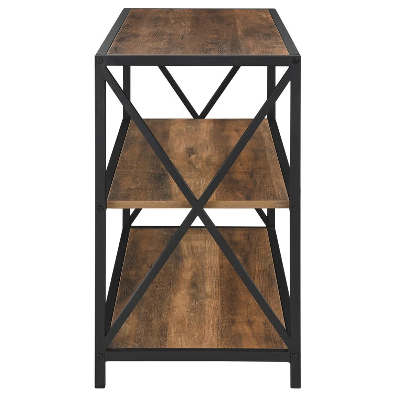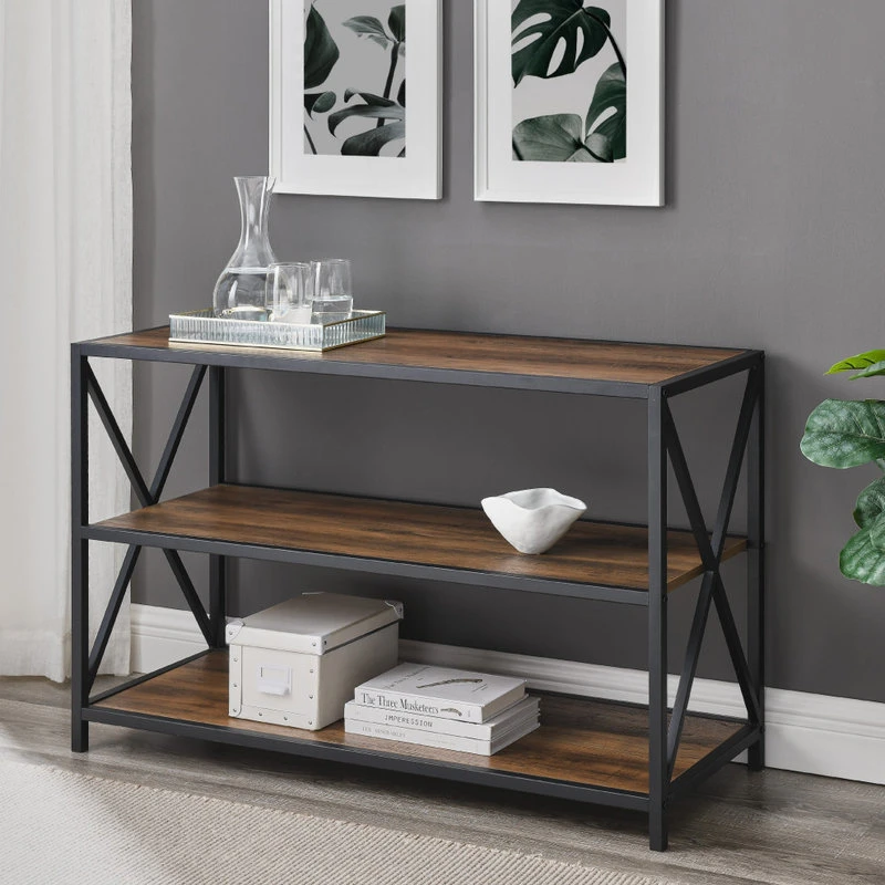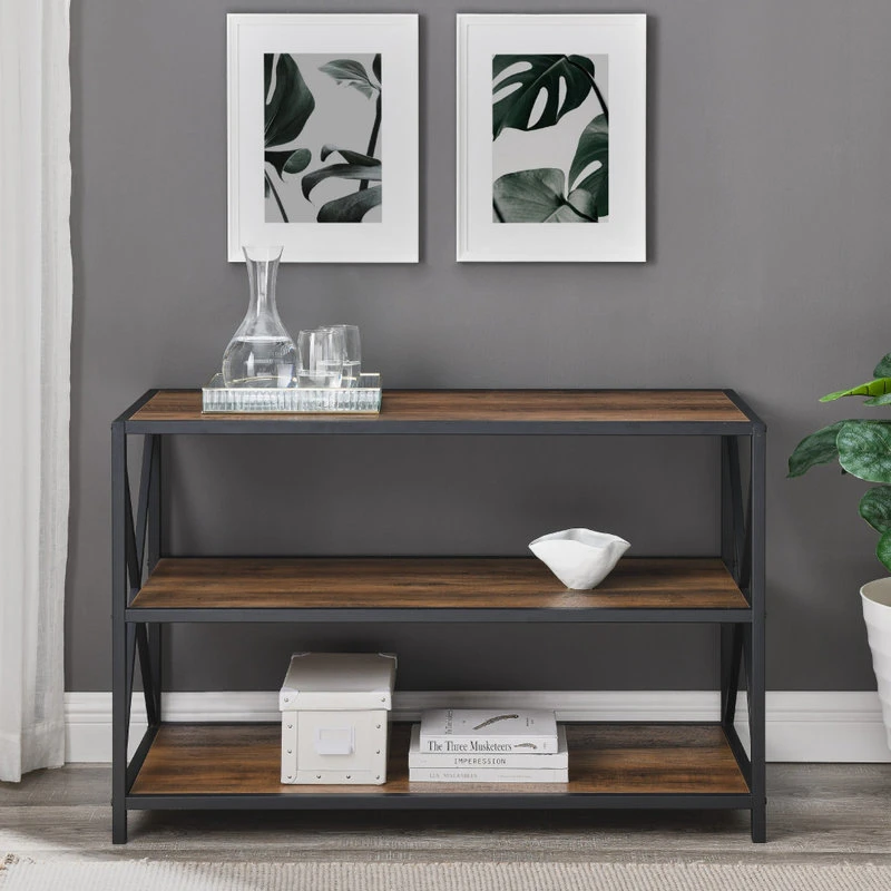 Showcase your books, magazines, media, and more with this beautiful bookcase. Durably constructed of high-grade MDF and powder coated metal, together create a sturdy, yet stylish shelving unit. The combination of metal and wood with x-shaped sides give a rustic farmhouse aesthetic, perfect for your entryway, bedroom, or living room. This bookshelf can make an urban industrial style statement, while also providing you with space to store your things. Decorate with your book collection, plants, and artistic elements to match your living space.