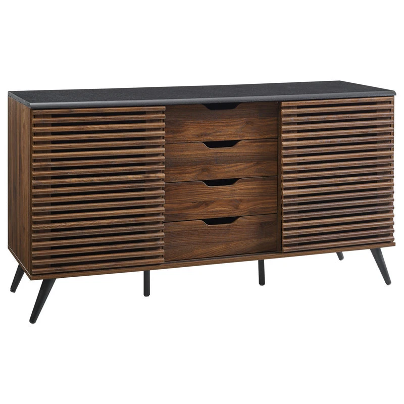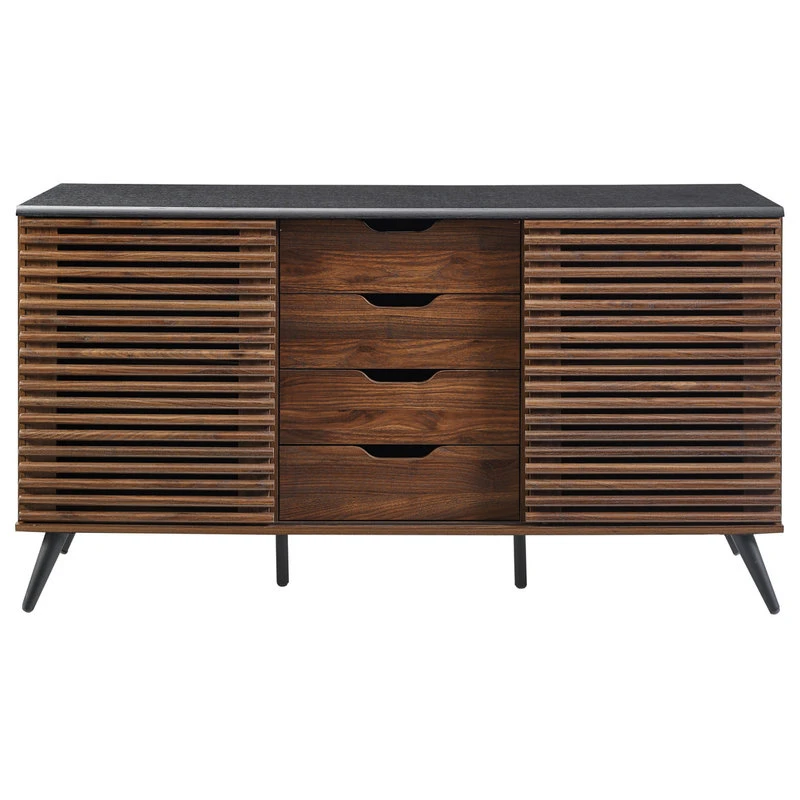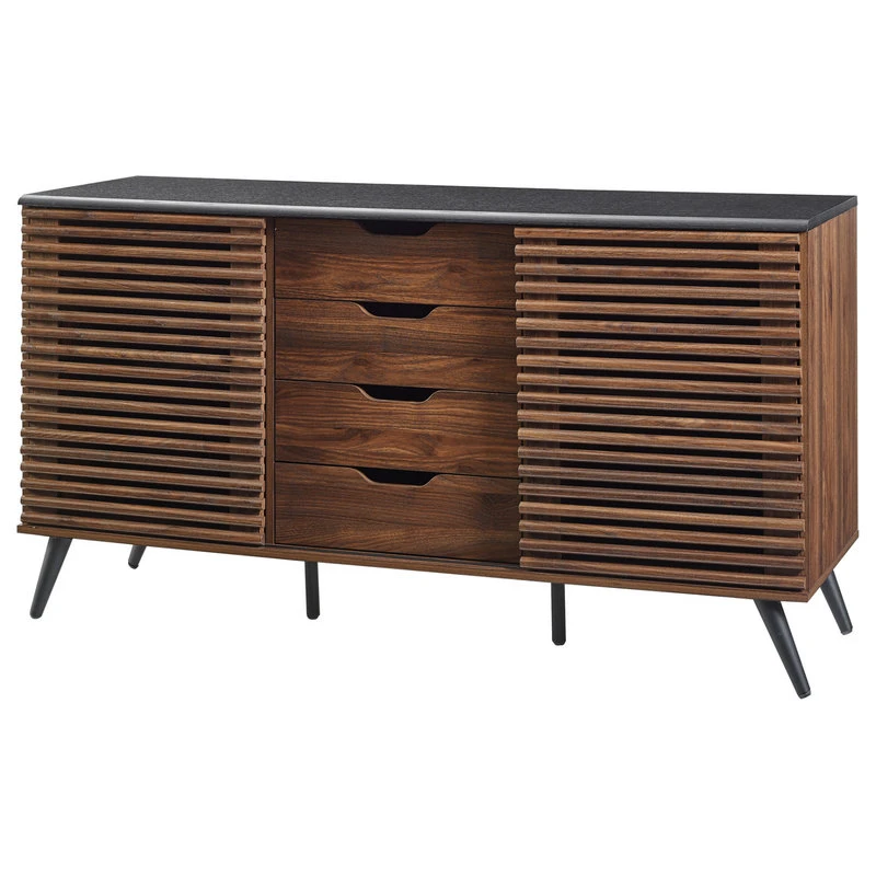 Channel an air of a sophisticated mystery in your living room with this urban sideboard. All your guests will admire the two unique slat doors that hide games for the party, dishes for dinner, or the next clue. They will expect the butler to come around the corner when you open one of the four attractive drawers with cutout handles to reveal drinks. They may even forget why they came when they notice the retro, steel angled legs and two adjustable shelves. And you can just sit back and enjoy the high-end party with a smirk knowing your secret to excellent modern home decor is safe with us. Place in the kitchen, dining room, living room, or bedroom to fit your refined storage needs.