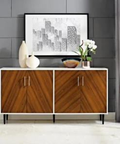Add something extra to your home with this modern color pop accent cabinet. Inside this contemporary console there are fixed shelves that create four compartments of various sizes, plus, the interior is finished with a fun color of paint. Instead of gaudy handles that would distract from the sleek exterior of this accent cabinet, there is a central cutout that allows you to open either of the doors. Each door is fastened with adjustable metal hinges. This hip storage shelf also comes with adjustable rubber feet so you can station this piece on whatever floor you’d like without a care.