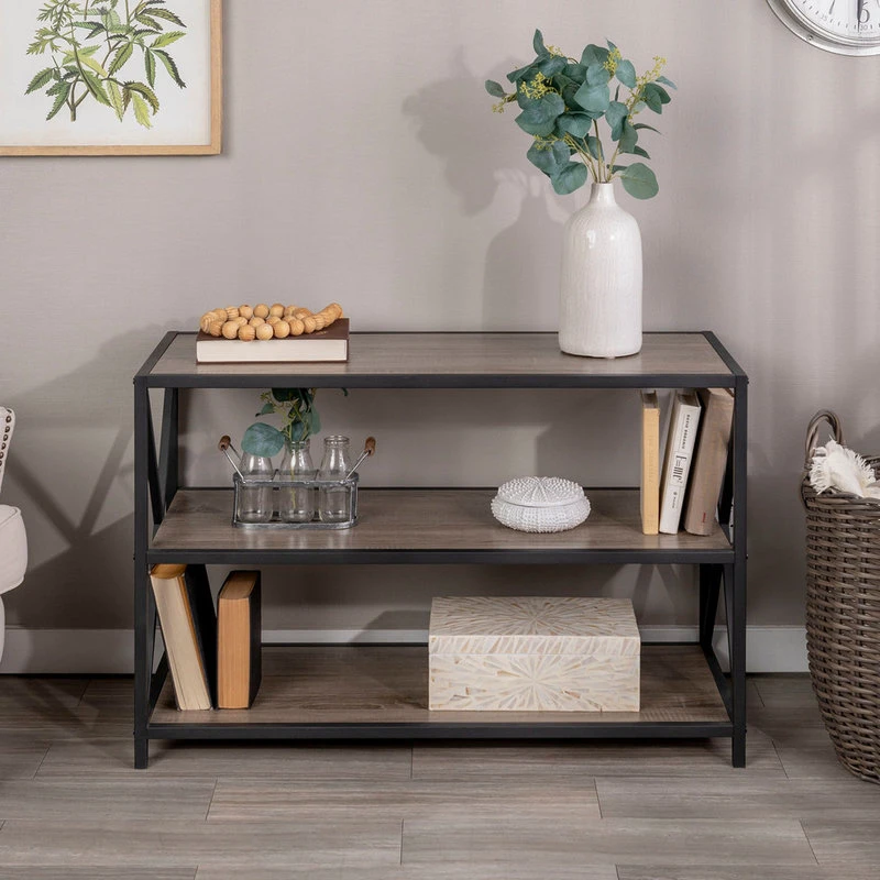 Collect all your treasures in one place with this industrial three shelf bookcase. When used as an entry or sofa table, your guests will get to know you with the pictures and souvenirs that you display on the three long shelves. Use the piece as a home office storage solution for documents and reading materials. The metal frame sports X side details that play into your rustic, urban farmhouse style. The sturdy MDF wood shelves will support anything you hand to them, so pile on your favorite books and memories.