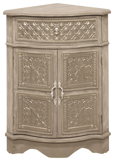 Corner table features top drawer that opens and two bottom doors that open to reveal storage space. Retro tin panels accent this table. Gray finish over MDF. Wipe with a dry cloth. Made in China.