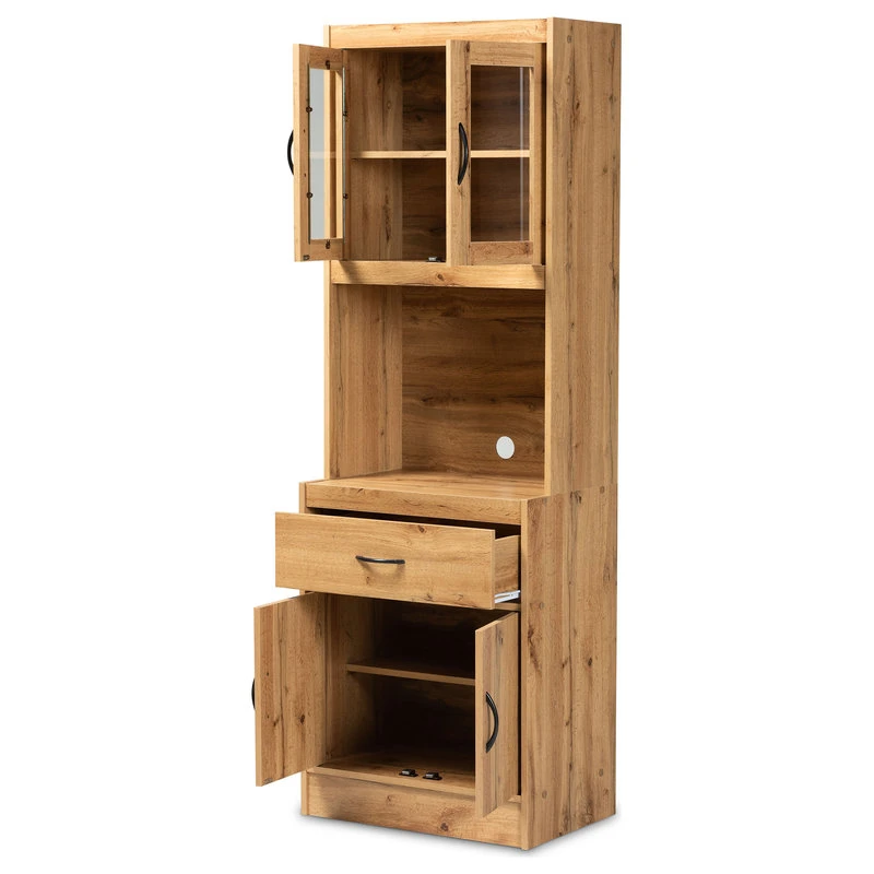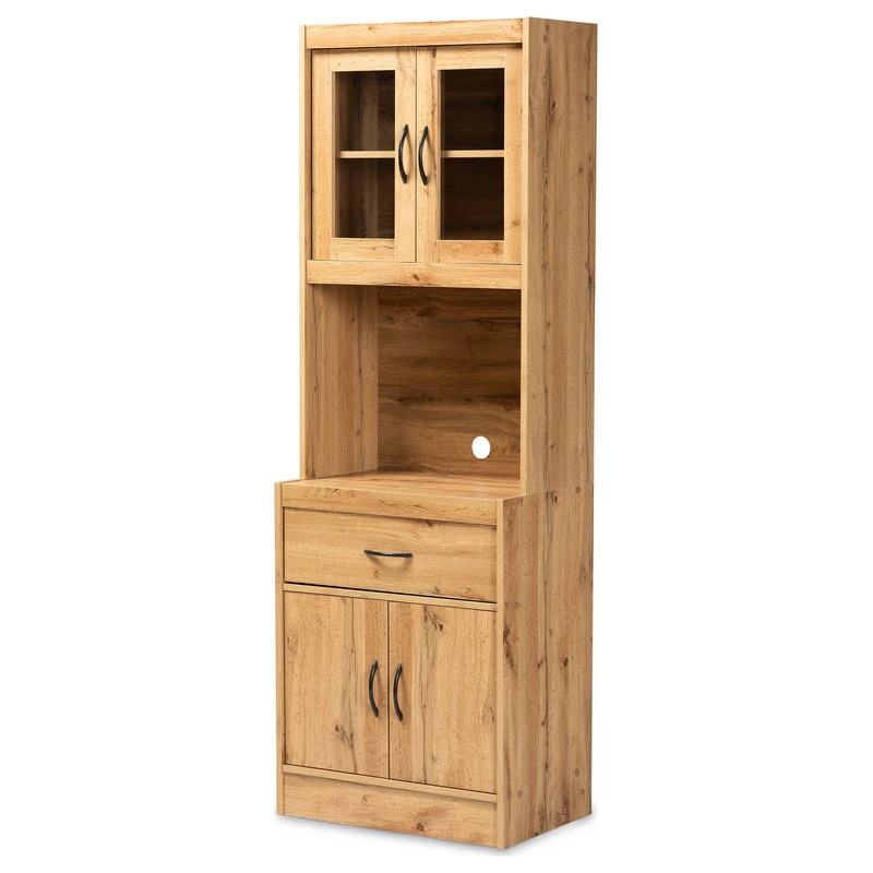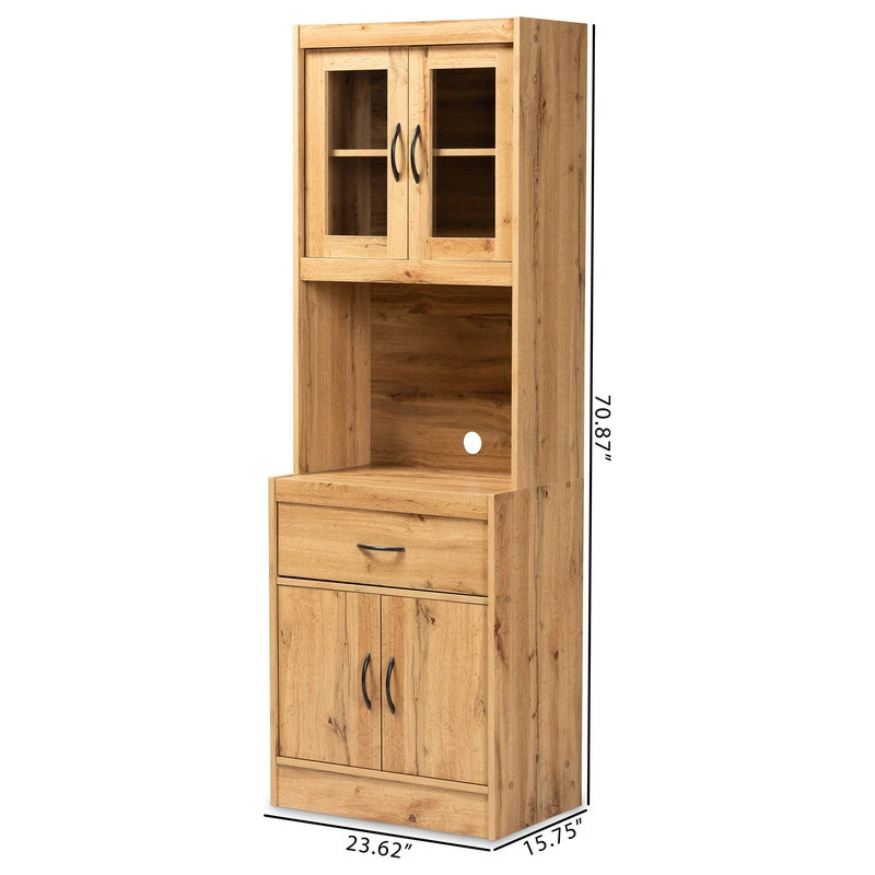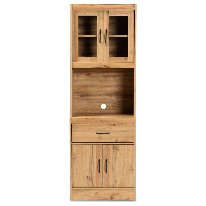 The simple yet elegant design of the Laurana cabinet organizes your kitchen in modern style. Made in Malaysia, this cabinet is constructed from solid wood featuring a natural oak brown finish that easily coordinates with modern interiors. A total of four shelves located behind the doors of the Laurana provide space for large cookware, while one large drawer easily organizes kitchen utensils. Requiring assembly, the Laurana features a circular opening in its back panel for convenient cord management of a microwave, coffee maker, and other appliances. With ample space for both storage and display, the Laurana cabinet is a superb addition to the modern home.